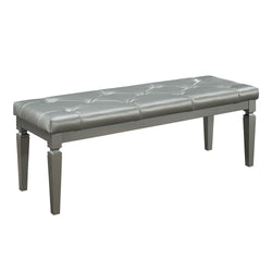 La splendeur règne en maître avec l'opulente collection de chambre à coucher Allura. Conçu pour s'harmoniser parfaitement avec le reste de la chambre à coucher ou pour être utilisé seul en tant qu’article décoratif fonctionnel, cet élégant banc de lit pour la chambre à coucher est doté de robustes pattes en bois sculptées et d'un élégant revêtement aspect cuir argenté. Le capitonnage de boutons en cristal acrylique ajoute une touche de luxe. Le banc de lit Allura rayonne d'un goût audacieux et d'une sensibilité exceptionnellement moderne, il est donc parfait pour l'aventurier audacieux à la recherche d'un confort dynamique.