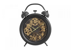 - A stylish, vintage inspired 12" round table clock with a unique moving gear mechanism in a sophisticated dark brown finish.