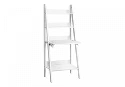 - Durably designed 61"h leaning ladder style computer desk in a white laminate, finished on all sides, which can securely attach to a wall with the included hardware.