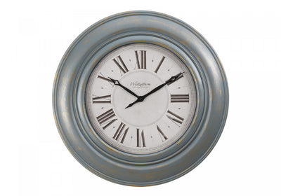 - Stylish 30" round wall clock in antique blue with subtle brushed gold accents for an elegant, transitional style, home decor accent.