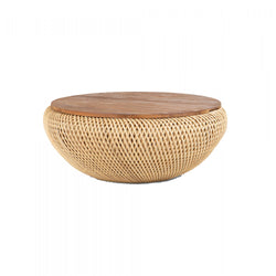 - Made from ethically sourced natural materials, including a sturdy reclaimed teak wood top with a traditional rattan weave for the base.