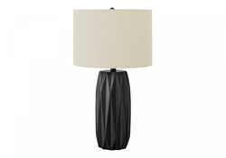 - Bring some sophisticated styling to your contemporary space with this textured, 25"h black ceramic table lamp fitted with a ivory linen drum shade and black finial on top, attached with a 6ft long black cord.