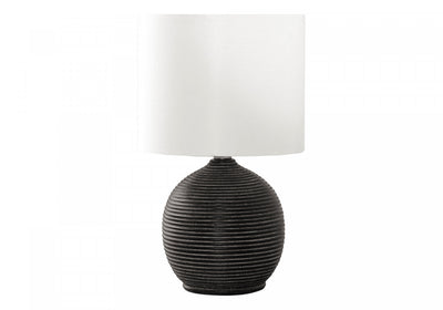 - Contemporary 16"h table lamp with a stylish beehive design textured finish base in trendy black resin, and a simple drum style ivory fabric shade to brighten a living room, bedroom, or office space.
