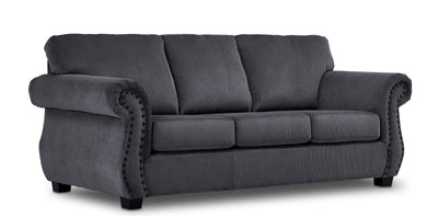 Découvrez le style élégant et rétro du sofa Brooklyn. Recouvert d'un tissu moderne en velours côtelé dans un élégant fini gris, ce sofa ajoutera une touche de style rétro à votre intérieur. Avec ses élégants appui-bras arrondis qui assurent le confort de vos bras et sa bordure de clous à griffes qui rehaussent l'aspect rétro, ce sofa est à la fois superbe et confortable. Les ressorts anti-affaissement en acier de calibre 8 dans l'assise et en acier de calibre 11,5 dans le dossier assurent le soutien. Les coussins d'assise amovibles en mousse d'une densité de 2 lb offrent un confort supplémentaire et facilitent le nettoyage, car les coussins peuvent être tournés. Grâce à sa structure en bois dur et en bois composite, ce sofa garantit sa solidité et sa durabilité pour les années à venir. Pour une touche rétro, deux coussins décoratifs se mélangent parfaitement à l'esthétique de ce sofa. Magnifiquement conçu pour compléter tout décor de salle de séjour moderne ou rétro, vous pourrez toujours profiter du confort et de l'esthétique de ce sofa. Fièrement fabriquée au Canada, la collection Brooklyn allie un design classique à un savoir-faire canadien. Le sofa Brooklyn vous permettra de vous détendre, de lire ou de discuter avec vos amis et votre famille.Dimensions du produit: Profondeur: 37", Hauteur: 36", Largeur: 85",