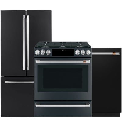 Café Ens. d'électroménagers de cuisine avec Réfrigérateur avec porte à deux battants, cuisinière au gaz et lave-vaisselle encastré noir mat