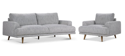 - Ce mobilier au style élégant présente des appui-bras légèrement évasés et un doux tissu gris, offrant un aspect intemporel qui mélange l’élégance au confort quotidien et charme contemporain.