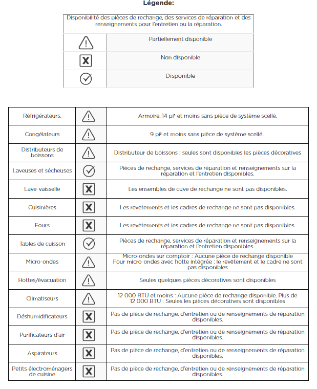 Bien que la plupart des pièces soient disponibles à l’achat, sauf indisponibilité à court terme, les appareils et pièces suivantes ne sont pas réparables.