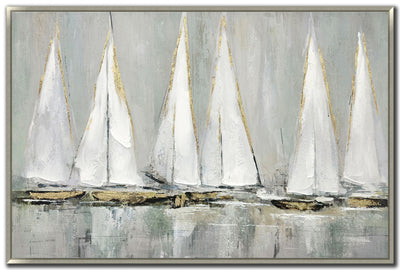This abstract representation of sailboats, with soft white and gold tones, brings a serene coastal vibe. Ideal for modern or coastal decor, the gentle colours and minimalist style make it both elegant and soothing.Dimensions du produit: Profondeur: 1.5", Hauteur: 31", Largeur: 46",
