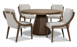 Apportez chaleur et sophistication à votre espace repas avec l’ensemble de salle à manger 5 mcx ronde Elure avec plateau tournant. Fabriquée à partir de placages d'orme de première qualité et de bois d'hévéa massif, la table présente un riche grain de bois naturel et une silhouette élégante, mélangeant l'élégance moderne au luxe intemporel. En son centre, un plateau tournant parfaitement intégré permet de servir sans effort, tandis que la base sculpturale offre un soutien durable et un style raffiné, parfait pour les repas de tous les jours et les rassemblements spéciaux. Associé aux chaises sans bras rembourrée Elure latté, cet ensemble offre un équilibre idéal entre confort et design contemporain. Recouvertes d'un tissu performant et durable, les chaises résistent aux taches, à la décoloration et à l'usure, garantissant un confort de longue durée au quotidien. Leur douce teinte latté se marie facilement avec les intérieurs modernes ou transitionnels, ajoutant de la chaleur sans surcharger votre décor. Le design distinctif de l'assise offre un soutien exceptionnel tout en créant une ambiance décontractée et relaxante. Ensemble, la table et les chaises Elure créent un cadre accueillant et polyvalent pour la famille et les invités