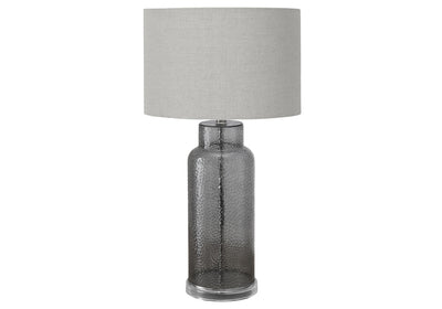 - This contemporary, 28"h table lamp features a textured, translucent grey glass body on a clear acrylic base and topped with a sophisticated grey fabric shade, making it a stylish accent in a living room, bedroom, or home office space.