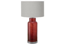 - This contemporary, 28"h table lamp features a textured, translucent red glass body on a clear acrylic base and topped with a sophisticated grey fabric shade, making it a stylish accent in a living room, bedroom, or home office space.
