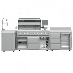 - Built to last with sturdy 304 stainless steel burners and chic white sintered stone countertops, this outdoor kitchen is a blend of durability and modern style.
