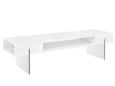 Simple, stylish, and sophisticated – this clean-lined tv stand flaunts all the elements of contemporary styling. We feature a minimalistic design; they stand sports a rich glossy white finish atop a tempered glass frame for a luxurious look while ensuring durability and easy maintenance. The sleek architecture entails an open compartment in the middle providing sufficient space to accommodate all audio/video components. The expansive stand top is designed for staging most flat-panel tvs up to 60”. Our tv stand will complement every other colour and stay in trend forever, finished in a pure white finish.Dimensions du produit: Profondeur: 15.75", Hauteur: 15.75", Largeur: 59",