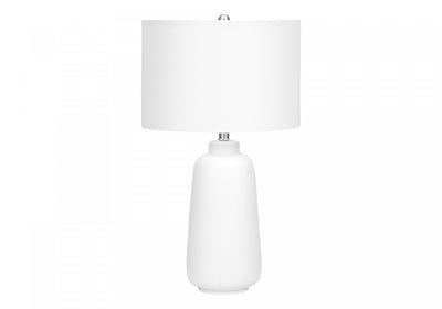 This beautiful modern style 26"h table lamp with a subtly textured cream ceramic base and ivory linen drum shade, topped with a round silver finial is the perfect way to add a contemporary touch in your living room, office or bedroom. The convenient 3-way switch holds a single bulb (not included) with a maximum voltage of 100w/120v, allowing you to adjust the lighting to suit the ambiance in a room. With a 5ft clear cord attached to the base, this versatile accent lamp can be placed on an end or side table, or nightstand as an additional lighting option. Made with high quality materials, this decorative lamp includes a 2 year limited warranty against manufacturer's defects for your satisfaction.Dimensions du produit: Profondeur: 15", Hauteur: 25.5", Largeur: 15",