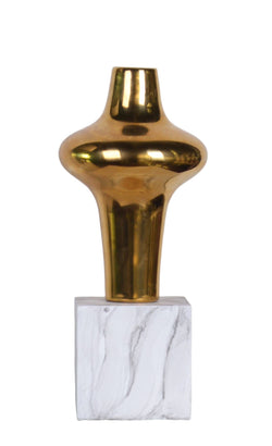 Ajoutez une touche d'élégance moderne à votre intérieur avec cette sculpture décorative de grande taille. Dotée d'une silhouette élégante et contemporaine, elle constitue à la fois un article de décoration raffinée et une affirmation artistique audacieuse. La partie supérieure est finie dans une teinte or poli qui reflète magnifiquement la lumière, ajoutant une chaleur rayonnante et une touche luxueuse à votre espace. À la fois attrayante et sophistiquée, elle rehausse instantanément n'importe quelle pièce grâce à sa brillance et à sa présence modernes. La stabilité et la substance de l’article sont assurées par une base inspirée du marbre et joliment veinée, qui confère à la sculpture une forme élégante. Les tons blancs froids et la texture subtile de la base équilibrent le dessus doré avec une élégance intemporelle, ce qui lui permet de s'intégrer parfaitement dans les intérieurs modernes et classiques. Qu'il soit exposé sur une tablette, une console d'entrée ou une table de centre, cet article décoratif est conçu pour faire impression. Le contraste remarquable entre l'or chaud et le marbre froid crée un point central raffiné, alliant durabilité et style pour une amélioration polyvalente et sophistiquée de la maison.
