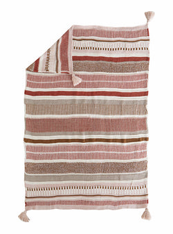Enveloppez-vous de chaleur et de charme rustique avec ce magnifique jeté rayé texturé. Avec son mélange de teintes en rouge, brun, beige et blanc, sa palette terreuse ajoute instantanément une touche chaleureuse et accueillante à votre espace. Qu'il soit drapé sur votre sofa, étendu sur votre lit ou posé sur un fauteuil, ce jeté rehausse votre intérieur grâce à son design polyvalent et à son attrait intemporel. Le motif rayé audacieux et la variation subtile des couleurs s'intègrent parfaitement dans un décor d'inspiration bohème, champêtre ou rustique, créant ainsi un point central confortable dans n'importe quelle pièce. Conçu pour le confort et le style, il constitue une couche douce et chaude, idéale pour les soirées fraîches ou les week-ends tranquilles passés en compagnie d'un bon livre. Les pompons décoratifs à chaque coin confèrent un fini ludique et texturé qui ajoute de la personnalité et des détails artisanaux. Que vous vous détendiez ou que vous redécoriez, ce jeté est un moyen facile d'infuser votre espace de confort et d'élégance décontractée, tout en vous gardant au chaud toute l'année.