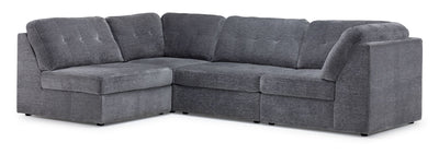 Voici le sectionnel modulaire de 4 mcx Jayce - le mélange parfait de confort moderne et de style pour votre espace de vie. Fabriqué avec une attention méticuleuse aux détails, ce sectionnel allie harmonieusement la forme et la fonction. Le moelleux tissus gris évoque l’élégance, tandis que le design modulaire offre des arrangements d’assises polyvalents pour s'adapter à vos préférences uniques. Installez-vous dans les sièges profonds et rembourrés qui procurent une détente inégalée, et profitez du soutien de la structure robuste en dessous. Le design épuré est complété par de chics pattes noires, qui ajoutent une touche d'élégance contemporaine. Que vous receviez des invités ou que vous vous détendiez après une longue journée, le sectionnel modulaire de 4 pièces Jayce offre l'équilibre parfait entre élégance et confort. Rehaussez votre décoration intérieure avec ce mobilier exceptionnel, conçu pour transformer votre salle de séjour en un havre de confort et de style.Dimensions du produit: Hauteur: 33",