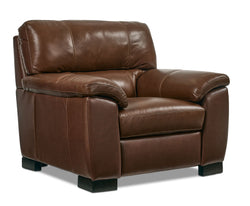 Le fauteuil en cuir Maddox ajoute un charme intemporel et un confort luxueux à votre salle de séjour ou à votre sous-sol. Recouvert d'une riche couleur cognac, ce fauteuil s'harmonise parfaitement avec un décor rustique ou moderne. Fabriqué en cuir entièrement corrigé, ce fauteuil présente une texture de grain naturel qui lui confère un aspect raffiné. Grâce à sa douceur luxueuse et à sa durabilité accrue, ce fauteuil conservera sa beauté et son style sophistiqué au fil du temps. Il est fabriqué avec une mousse d’une densité de 2,1 qui offre un soutien supérieur et un confort de longue durée, aidant les coussins à conserver leur forme. Le système de soutien sans affaissement du coussin d'assise garantit un confort constant et l'intégrité de la structure. Les appui-bras rembourrés et moelleux offrent un endroit confortable pour reposer vos bras, contribuant à la douce sensation de détente et au confort ergonomique de ce fauteuil. Fabriqué en bois massif et en placage, le Maddox offre une stabilité de longue durée et une touche d'élégance naturelle. Résistant, confortable et élégant, le fauteuil en cuir Maddox est le mobilier de tous les jours idéal pour se détendre avec raffinement.