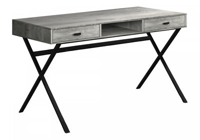 This widely-applicable industrial style desk finished in a grey reclaimed wood look is equally functional as a computer desk, writing table or study centre. Sized for small homes, apartments or condos, space saving is a breeze thanks to this piece that is supported by a sturdy black metal x-design base to ensure stability and a comfortable work environment. This office desk is equipped with two convenient and easy-open storage drawers for all you need to store away while not in use. With lots of space to push the chair in, the desk is compact and the thick panel top has the perfect amount of surface space for a laptop/tablet, lamp, notebook and some important supplies to get the job done.Dimensions du produit: Profondeur: 47.25", Hauteur: 29.25", Longueur: 61", Largeur: 23.75",