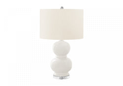 - A contemporary, trendy and stylish 25"H cream ceramic table lamp in a double gourd shape on top of a thick, acrylic crystal-like base and topped with a chic drum ivory shade.