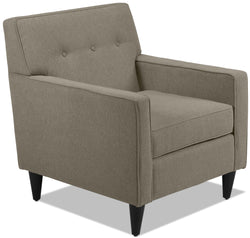 - Mid-century modern influences are seen in the track arms, button tufting and tight back.