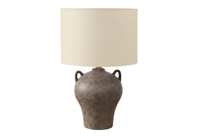 Turn your living room, bedroom, or office into a chic and stylish sanctuary with this handsome 22" table lamp. The stunning brown ceramic base designed like an ancient jug in a mottled finish and topped with a contemporary beige fabric shade, is the ideal accent to brighten any end or side table, nightstand, or console. The convenient on/off turn knob switch operating up to a 100W bulb (not included), allows you to easily create the right ambiance in a space. Versatile for transitional style decors, this lamp offers both elegance and practicality in a living room, bedroom, or home office. For your confidence, we include a 2 year limited warranty against manufacturer defects, ensuring a reliable and quality made accent lighting. Illuminate any room with this timeless and fashionable ceramic table lamp for an exquisite decorative transformation.Dimensions du produit: Profondeur: 14", Hauteur: 22.25", Longueur: 6", Largeur: 14",