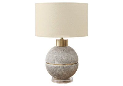 Make your home into a haven of style with our 26" table lamp, a striking fusion of contemporary design and modern flair. Crafted with a unique, textured finish base in a stunning light brown resin and accented in gold around the globe shaped body, this lamp is not just a source of lighting but an eye-catching decorative accent that will brighten any room. This lamp sits atop a clear acrylic base and finished off with a chic beige fabric shade, making it a perfect fit for your living room, bedroom, or office. Whether setting the mood for a cozy evening or need focused light for your work, its convenient 3-way switch allows you to adjust the ambiance with the use of a 100W bulb (3-way bulb not included) to suit your lighting needs. Place this stylish accent lamp on an end or side table or use it as a bedside lamp on your nightstand and let its glow create an inviting atmosphere. Plus, enjoy peace of mind with our 2 year limited warranty against manufacturer defects, ensuring this lamp will light your way for years to come. Illuminate your space and make a statement with this fashionable and trendy brown resin table lamp with a beige shade_x0014_ where function meets fabulousness in perfect harmony.Dimensions du produit: Profondeur: 16", Hauteur: 25.5", Longueur: 13", Largeur: 16",