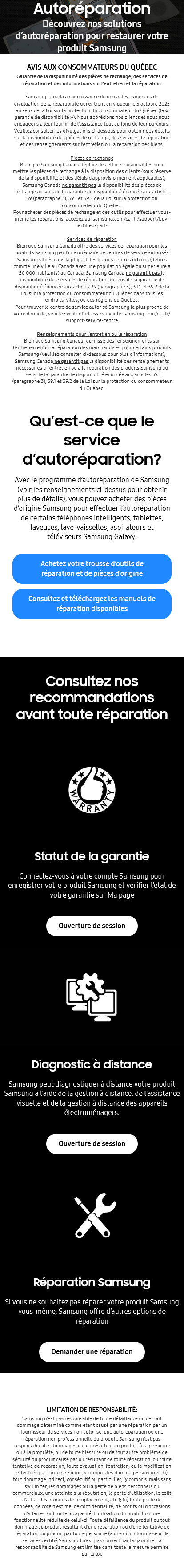 Bien que nous fassions tout notre possible, nous ne garantissons pas la disponibilité des pièces, services de réparation ou renseignements nécessaires à l’entretien/la réparation pour cet article.