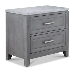 • Le dessus de la table de nuit en marbre blanc et gris ajoute un accent riche et luxueux qui s'harmonise parfaitement avec le fini en bois pour un aspect raffiné et haut de gamme.