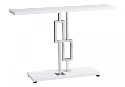 Make a statement with this multi-functional, modern console accent table. The glossy white rectangular top and base brings a chic aesthetic while the polished geometric chrome base provides all the drama! Show it off in your hallway or entryway as an accent piece to display decorative objects, hold some books or simply to place your keys and mail. Bring it into the living room and use it to set up a drink and appetizer station or behind your sofa for display. Compact enough even for small spaces, this console table will be the most versatile furniture you own. Assembly is required.Dimensions du produit: Profondeur: 12", Hauteur: 31.75", Largeur: 47.25",