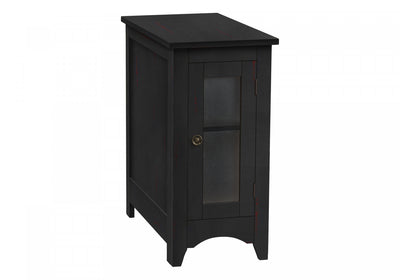 - Versatile with a space saving design, this narrow accent table in a charming black veneer finish with subtle red distressing looks right at home in a living room as an end or side table or in the bedroom as a convenient nightstand.