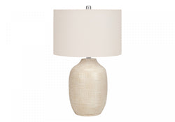 - Bring some warmth and brightness to your home with this stylish 26"h contemporary table lamp in a elegant ginger jar shape, finished in a textured glazed cream ceramic and topped with a ivory linen drum shade and silver finial.