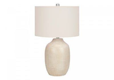 Add a casual elegant ambiance to your living room, home office, or bedroom with this stylish and fashionable 26"h table lamp. This ginger jar shaped lamp features a glazed cream ceramic base with a geometric texture and a linen ivory shade, finished with a silver finial on top. Create the perfect lighting conditions using the 3-way switch that holds a single bulb (not included) for a maximum output of 100w/120v, allowing you to adjust the brightness in a room. Place this versatile, contemporary accent lamp on any end or side table, nightstand or bedside table to create a warm and inviting space. Made with durable quality materials ensuring longevity, this lamp includes a 2 year limited warranty against any manufacturer's defects for a worry-free purchase.Dimensions du produit: Profondeur: 16", Hauteur: 25.75", Largeur: 16",