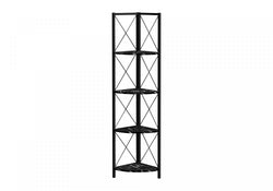 - This corner shelf features a three-leg black metal frame, allowing it to sit tight against the wall