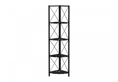 Perfect for photo frames, plants, other decorative items and even kitchen accessories, this transitional-style corner bookcase will upgrade your decor. Including 4 black marble-look display shelves, this corner display unit features a three-leg black metal frame and a X-design to add modern flare wherever you choose to place it. This corner etagere bookcase is sure to impress. Assembly is required.Dimensions du produit: Profondeur: 12.5", Hauteur: 59.25", Largeur: 17.5",