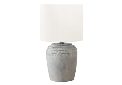 Refresh your living room, bedroom, or home office with this stylish 17" table lamp in grey ceramic. The elegant, jar shaped grey base with a textured finish along the top is paired with an ivory fabric shade for a contemporary upgrade. This lighting accent is ready to brighten any corner of your home, whether placed on an end or side table, a nightstand, or your office desk, providing just the right amount of light to create the right ambiance. The on/off turn knob switch operating up to a 60W standard bulb (not included) makes it easy to illuminate your space with a simple twist. This decorative lamp includes up to a 2 year limited warranty against manufacturer defects ensuring that it remains a lasting fixture in your home. Embrace the classic styling of this ceramic table lamp with a modern drum shade for a fashionable and on-trend accent piece that compliments all decors.Dimensions du produit: Profondeur: 9.5", Hauteur: 17", Longueur: 4", Largeur: 9.5",